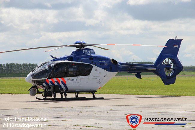 Middelburg - 12-05-2012 De politieheli PH-PXD die was ingezet voor de uitreiking van de for freedom award 2012 landt op vliegveld Midden Zeeland ...