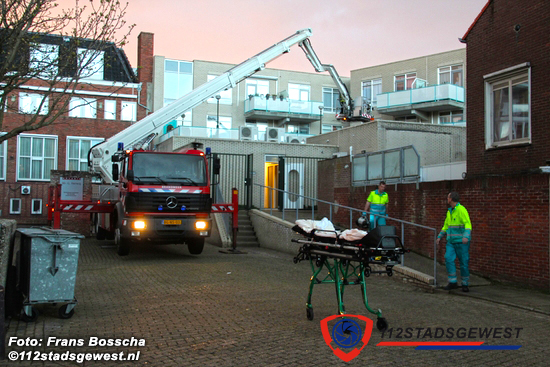 Nadat de patiënt via het balkon naar beneden was gehaald is hij met spoed per ambulance naar het ziekenhuis gebracht.